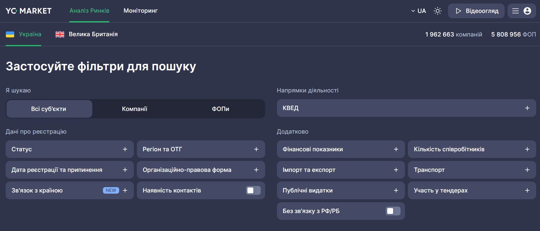 В мене вже є акаунтТут ви дізнаєтесь як застосовувати YС.Market в щоденній роботі для аналізу ринку, пошуку нових клієнтів, партнерів та постачальників і приймати стратегічні рішення базуючись на даних